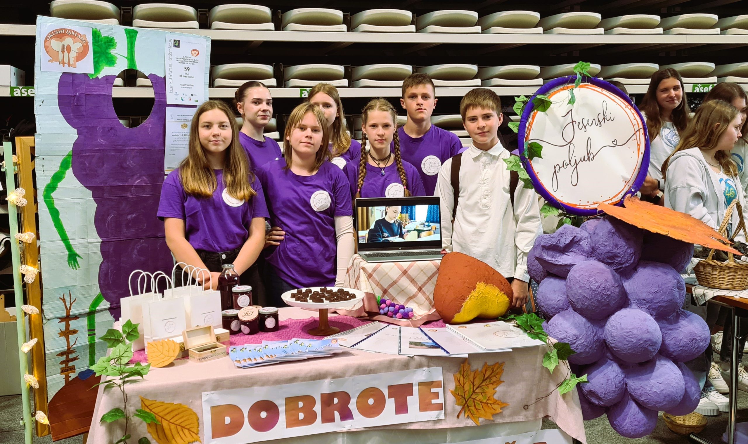 Naša šola se je predstavila s produktom “Jesenski poljub”. Ogledali smo si predstavitve ostalih šol in poskusili številne izvirne kulinarične spominke: maronovo marmelado, kakijev sladoled, palačinke s teranovo marmelado, sladice v lončkih, bujto repo, piškote s suhim sadjem, semeni in fižolom, suhe goveje grižljajčke, sok iz črnine, ladjice z listnatim testom s salom, kokice iz svinjske kože, sladico s suhimi mravljami, ajdove dobrote, pokovko z orehi in karamelo in črni kruh ter črne kekse.