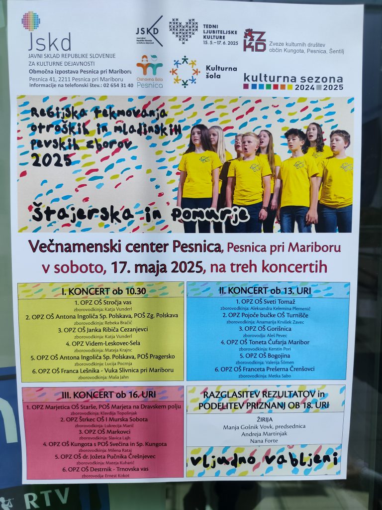 V soboto, 17. maja 2025, je Kulturni dom Pesnica pri Mariboru gostil regijsko tekmovanje otroških pevskih zborov Štajerske in Pomurja, ki poteka pod okriljem Javnega sklada Republike Slovenije za kulturne dejavnosti (JSKD). Dogodek je predstavljal vrhunec zborovskega ustvarjanja osnovnošolskih pevskih zasedb iz vzhodne Slovenije in hkrati priložnost za strokovno evalvacijo, medsebojno spoznavanje ter bogatitev repertoarja in interpretativnih pristopov.