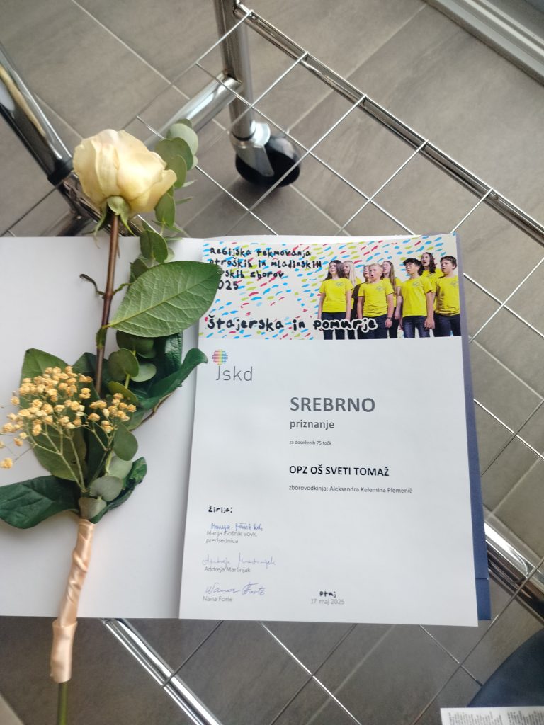 Starejša skupina otroškega pevskega zbora OŠ Sveti Tomaž je nastopila kot prva v drugem delu tekmovalnega koncerta. Predstavili smo se s tremi pesmimi. Strokovna žirija je opravila svoje delo in tako smo si pripeli srebrno priznanje. Na klavirju nas je spremljala Lea Munda.