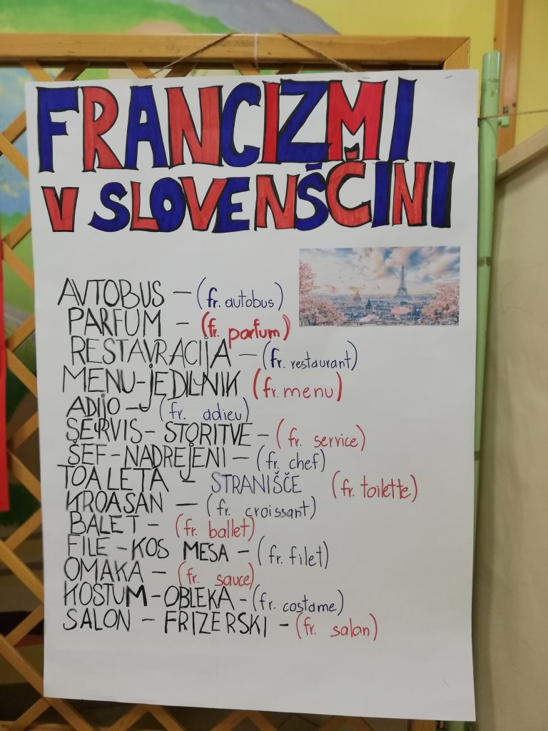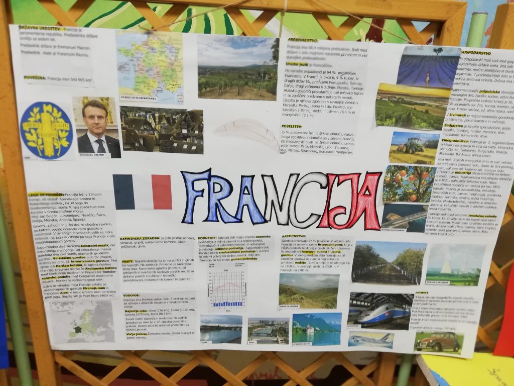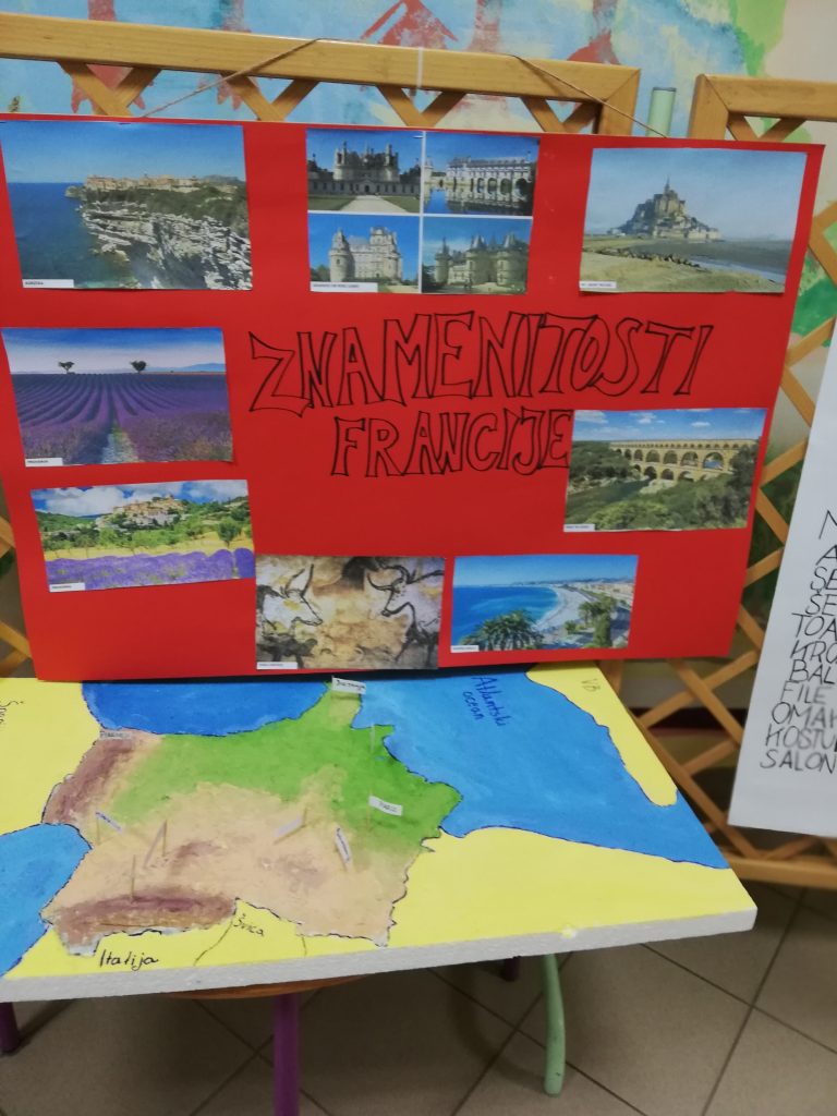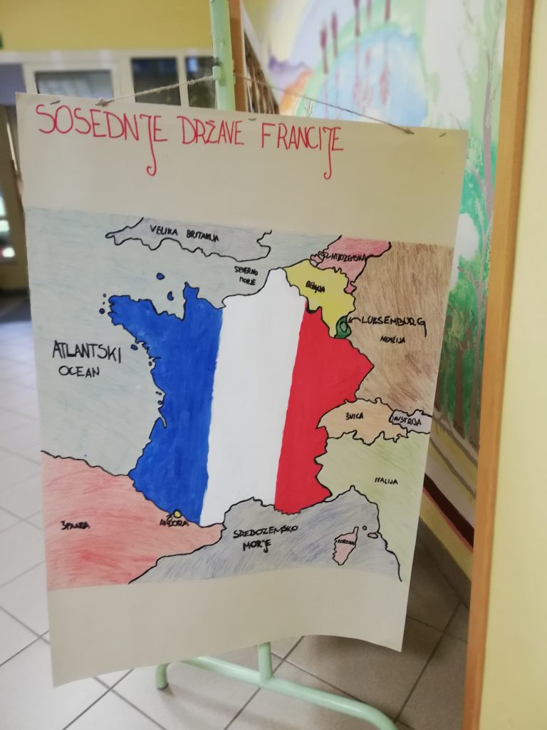 V četrtek, 8. maja 2025, bi morale v Ormožu pred grajsko pristavo potekati dejavnosti ob Dnevu Evrope, a je bila prireditev zaradi napovedi slabega in deževnega vremena odpovedana. Osrednja nit prireditve je bila spoznavanje držav EU. Z našimi učenci smo izbrali Francijo. Ker prireditve v Ormožu ni bilo, smo se odločili, da delček pripravljenega gradiva postavimo na ogled v avli naše šole. Pripravili smo osebno izkaznico države, predstavili glavno mesto, znamenitosti države, izdelali reliefni zemljevid Francije, zemljevid večjih rek in večjih mest ter sosednjih držav. Iskali smo francizme v slovenščini. Na karton iz lepenke smo narisali Mono Liso in Eifflov stolp. Predstavili smo nekaj znanih osebnosti. Učenci so se skupaj z razrednikom Markom res potrudili. Učiteljica Aleksandra nam je pomagala pri pripravi glasbene točke. Eva Tanaja in Teja bi zapeli pesem Mon Amour, ki je bila lanska predstavnica Francije za pesem Evrovizije.