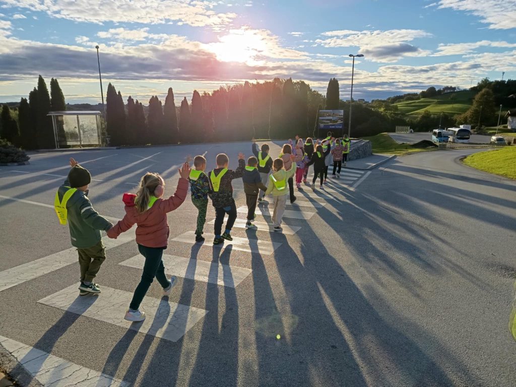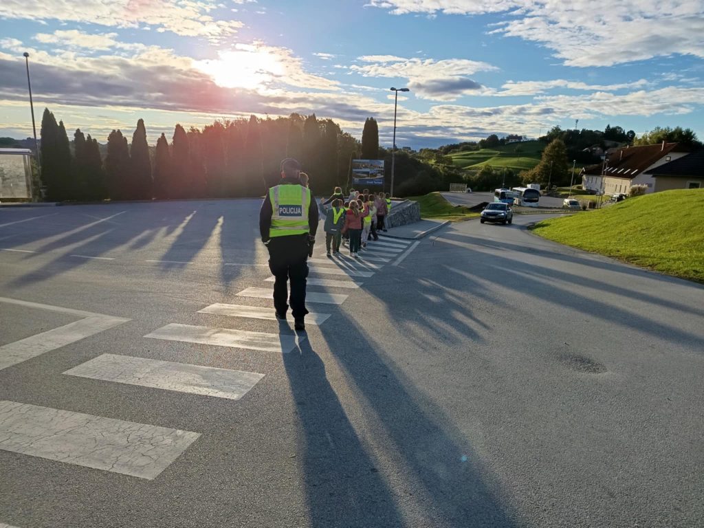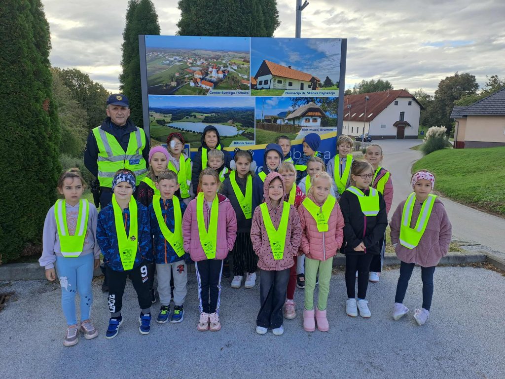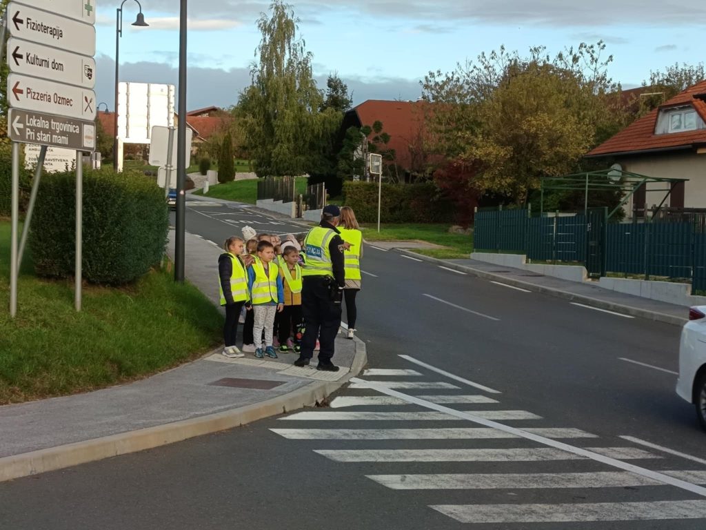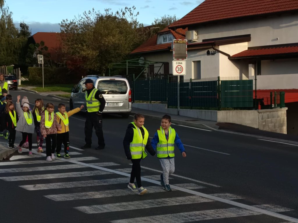 Obiskal nas je policist Aleš Meško in nas peljal po varni poti v bližnji okolici šole. Z njim smo se sprehodili učenci 1., 2. in 3. razreda.