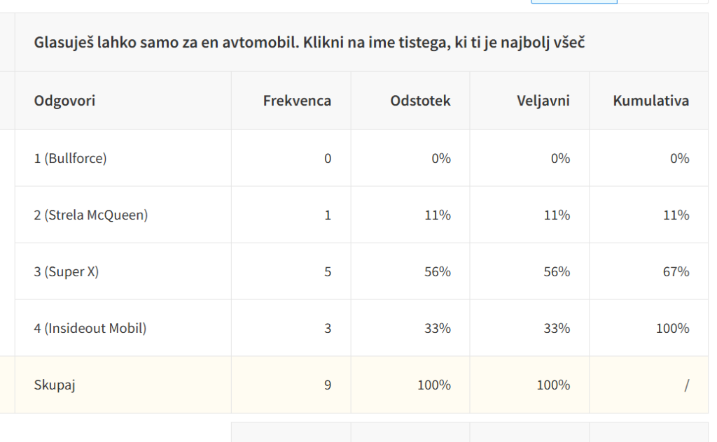 Danes smo imeli tehniki dan. Izbirali smo s katerim avtom se bomo predstavili na srečanju Go car go. Razdelili smo se v skupine. V prvi skupini sva bila jaz Sara in Manuel, ki sva načrtovala Strela McQueen avto. V drugi skupini sta bili Alja in Eva, ki sta načrtovali Insideout mobil. V tretji skupini sta bila Jan in Leon, ki sta načrtovala Super x avto. V zadnji četrti skupini pa so bile Eva Tanaja, Teja in Valentina, ki so načrovale Bullforce avto. Na koncu smo glasovali in izbrali Super x avto. Imeli smo se zelo lepo.