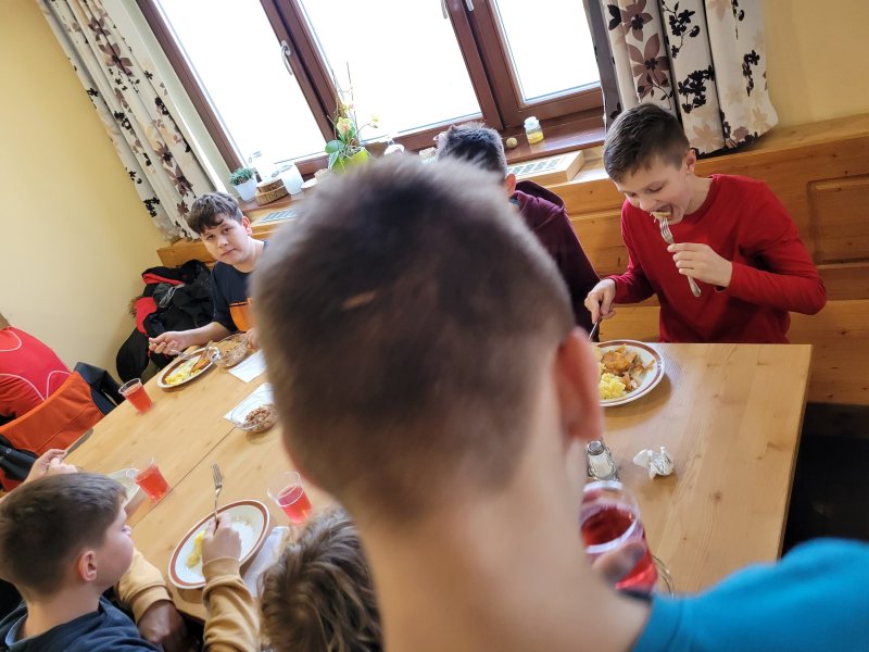 Danes smo prišli v Ribnico na Pohorju z avtobusom. Za kosilo smo jedli juho, dunajski zrezek, krompir in solato. Po kosilu smo imeli dolg odmor. V odmoru smo se veliko zabavali. Za večerjo smo jedli špagete. (Aljaž Prelogar)