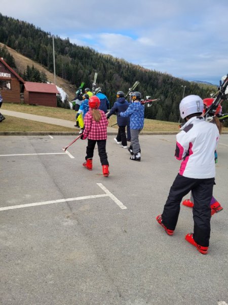 3. Po smučišču smo se peljali tako, da je bil pred nami učitelj in sicer obrnjen proti nam. Peljali smo se ravno, zavili, ravno, zavili in tako smučali do konca smučišča. (Nika Nedeljko)
