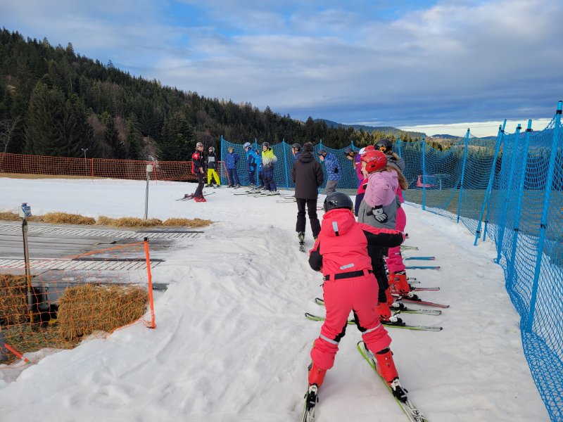 Danes smo imeli velike načrte. Na smučišču smo bili že zelo hitro, saj smo želeli obnoviti in nadgraditi naše znanje. Tudi po kosilu je bilo malo počitka, saj smo smučali že od 13. ure dalje – takrat je smučišče prazno in imeli smo ga čisto, čisto zase.