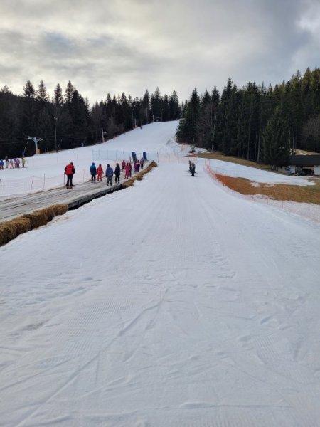 Danes smo imeli velike načrte. Na smučišču smo bili že zelo hitro, saj smo želeli obnoviti in nadgraditi naše znanje. Tudi po kosilu je bilo malo počitka, saj smo smučali že od 13. ure dalje – takrat je smučišče prazno in imeli smo ga čisto, čisto zase.