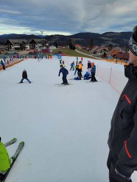 Danes smo imeli velike načrte. Na smučišču smo bili že zelo hitro, saj smo želeli obnoviti in nadgraditi naše znanje. Tudi po kosilu je bilo malo počitka, saj smo smučali že od 13. ure dalje – takrat je smučišče prazno in imeli smo ga čisto, čisto zase.