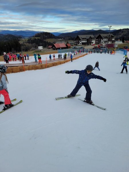 Danes smo imeli velike načrte. Na smučišču smo bili že zelo hitro, saj smo želeli obnoviti in nadgraditi naše znanje. Tudi po kosilu je bilo malo počitka, saj smo smučali že od 13. ure dalje – takrat je smučišče prazno in imeli smo ga čisto, čisto zase.