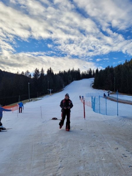Danes smo se vozili z vrha smučišča. Niti enkrat nisem padel! Z vlečnico se je zelo “fajn” voziti. Na smučišču je bila velika gneča. Dolgo smo čakali. (Anej Prapotnik)