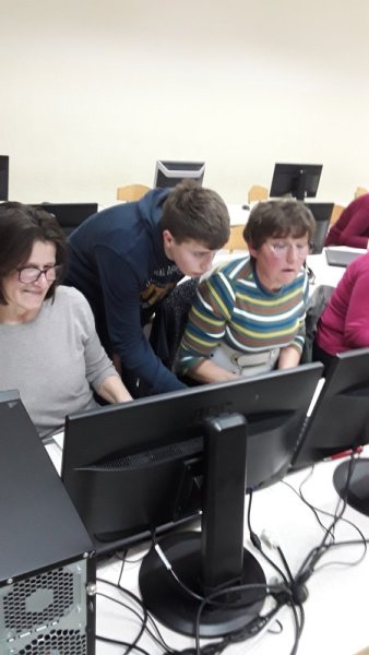 Naša šola dobro sodeluje z Društvom upokojencev. Tudi letos smo na šoli organizirali tečaj računalništva v okviru projekta Simbioza. Tečaja se je udeležilo 9 slušateljev. Pri delu so mi pomagali učenci naše šole. Sodelovanje med tečajniki in učenci je na zelo visoki ravni. Zanimivo je opazovati, kako učenci poučujejo dedke in babice. Ta projekt je na naši šoli že tradicija. Mi smo veseli, da lahko pomagamo, naši tečajniki pa vsako leto pridejo motivirani, da izvedo kaj novega na računalniškem področju. Vsem so nam za vzgled, kako nikoli ni prepozno, da se v življenju naučimo kaj novega. Upamo, da bo projekt trajal tudi v prihodnje. Tečaj je trajal 5 krat po eno uro in pol. Spoznali smo osnove Worda, si vstavili sliko v dokument, dokument natisnili. Tretji dan smo pošiljali elektronsko pošto po mailu. Čaka nas še pošiljanje pošte s pomočjo telefona, zadnji dan pa bomo vse skupaj utrdili.