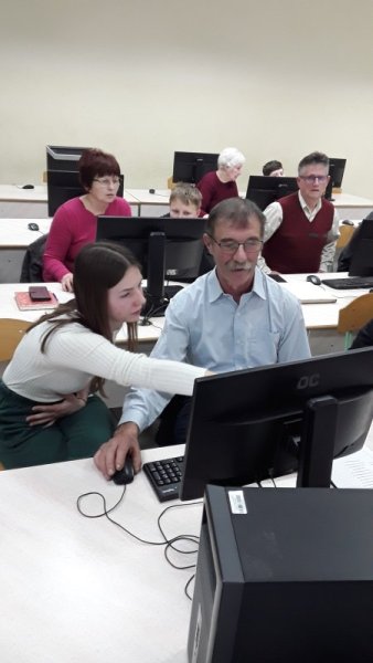 Naša šola dobro sodeluje z Društvom upokojencev. Tudi letos smo na šoli organizirali tečaj računalništva v okviru projekta Simbioza. Tečaja se je udeležilo 9 slušateljev. Pri delu so mi pomagali učenci naše šole. Sodelovanje med tečajniki in učenci je na zelo visoki ravni. Zanimivo je opazovati, kako učenci poučujejo dedke in babice. Ta projekt je na naši šoli že tradicija. Mi smo veseli, da lahko pomagamo, naši tečajniki pa vsako leto pridejo motivirani, da izvedo kaj novega na računalniškem področju. Vsem so nam za vzgled, kako nikoli ni prepozno, da se v življenju naučimo kaj novega. Upamo, da bo projekt trajal tudi v prihodnje. Tečaj je trajal 5 krat po eno uro in pol. Spoznali smo osnove Worda, si vstavili sliko v dokument, dokument natisnili. Tretji dan smo pošiljali elektronsko pošto po mailu. Čaka nas še pošiljanje pošte s pomočjo telefona, zadnji dan pa bomo vse skupaj utrdili.