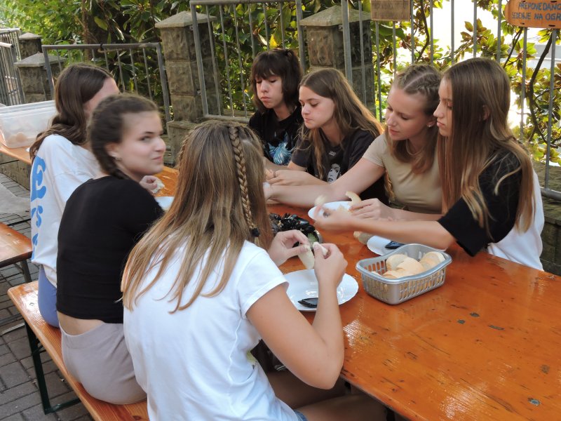 Ne moremo verjeti, danes je že četrtek, jutri gremo domov . Po opravljenem zajtrku in telovadbi, smo se odpravili v Portorož, na vrsti je bil turizem. Tega v Portorožu res ne manjka. Grand hotel Bernardin *****je res nekaj posebnega. Za njim se nam je prikazal hotel Histrion**** . Reševali učne liste, nato smo se pogovorili, kaj vse vpliva na turizem. Pot nas je vodila mimo slaščičarne. Kakšen sladoled. Mjami. Ste vedeli, da iz Portoroža lahko pridete v Strunjan skozi tunel, skozi njega je nekoč vozila železnica. V Strunjanu blizu solin se je podoba kraja močno spremenila. Najbolj nas je impresionirala naravna stena iz klifa. Čudovito. Pešačili smo mimo Pacuga in končno uspeli priti v Breženko. To pa je bil pohod in pol. Samo, da zvečer ne bi spet pešačili. Ko smo se najedli, naenkrat nismo bili več utrujeni, saj je bil prosti čas za odbojko, družabne igre, druženje. Čakali sta nas še dve vsebini: raziskovali smo obrežni pas morja. Ugotovili smo, da se morje zelo spreminja zaradi podnebnih sprememb. Saj drugače se 12. oktobra ne bi mogli kopati. Nato smo pripravili školjke na istrski način. Ta se razlikuje od dalmatinskeg. V istrskem ne uporabljamo paradižnikove mezge. Sami smo pripravili školjke pod učiteljevim vodstvom. Veste, da me zelo mika, da vam izdam, kdo sta bila kuharja. Imam čudovite posnetke, ki bodo zagledali luč na valeti. Zato vljudno vabljeni na našo valeto, kjer bo prikazano vse, kar ni za širšo javnost. Po večerji smo imeli zaključni ples. Srčki so kar poskakovali po plesišču. Mogoče bi ostali še kakšen dan? Jutri pa že domov. Lahko noč.