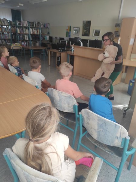 Ob kratki predstavitvi knjige so učenci uživali. Sledila je tudi pravljica uprizorjena s kamišibajem z naslovom MEDVEDEK RADOVEDEK.
