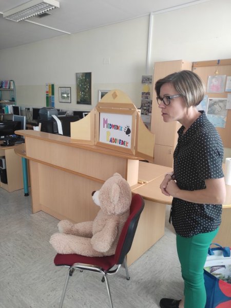 Ob kratki predstavitvi knjige so učenci uživali. Sledila je tudi pravljica uprizorjena s kamišibajem z naslovom MEDVEDEK RADOVEDEK.