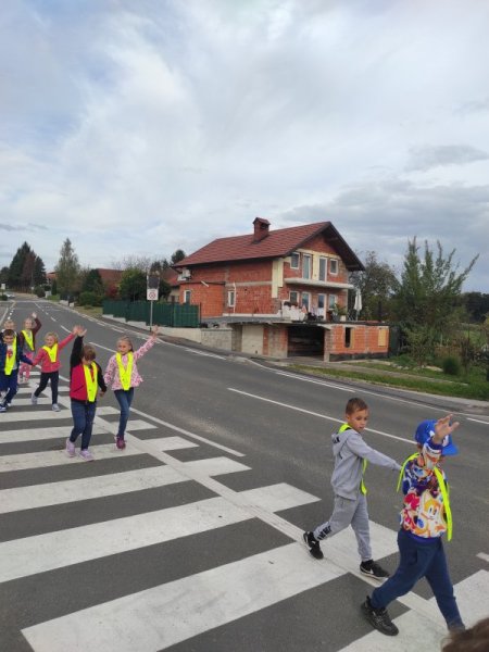 Obiskal nas je policist Aleš Meško. Učence je popeljal po varni poti v okolici šole. Dal jim je napotke v zvezi z varnostnim pasom pri vožnji z avtom in avtobusom.