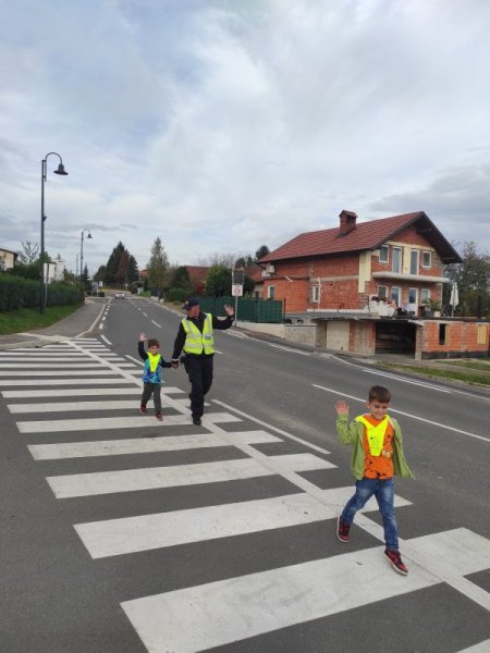Obiskal nas je policist Aleš Meško. Učence je popeljal po varni poti v okolici šole. Dal jim je napotke v zvezi z varnostnim pasom pri vožnji z avtom in avtobusom.