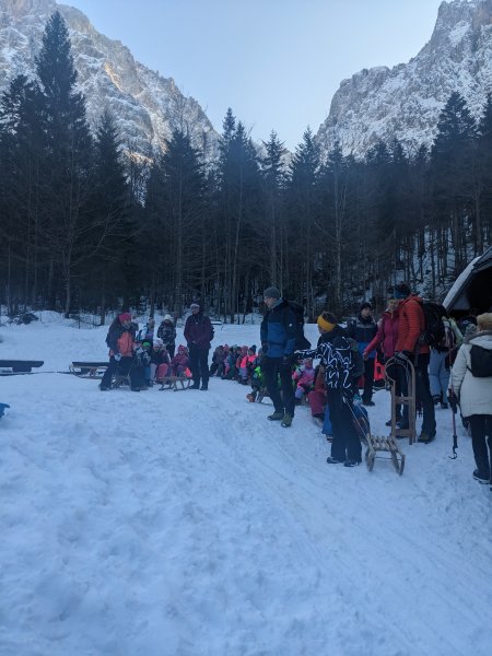 V soboto, 27. januarja, ob 5.30. uri smo se učenci, starši, spremljevalci, z avtobusom odpeljali iz Sv. Tomaža do Ormoža, kjer so nas že čakali ostali pohodniki. Planinsko društvo Maks Meško Ormož je pripravilo zimski planinski izlet v Krnico. Krnica je približno 6 km dolga dolina, ki leži južno od  Kranjske gore, na območju Triglavskega narodnega parka med mogočnim dvatisočaki. Peljali smo se mimo Ljubljane in zavili proti Kranjski Gori. Izstopili  smo pri jezeru Jasna in se odpravili proti Koči v Krnici, ki leži na nadmorska višini 1113 m. Pred kočo smo se igrali, popili vroč čaj, pojedli nekaj toplega. Nato smo se odpravili nazaj proti avtobusu. S sankami in lopatkami  smo se spuščali v dolino. Dan je bil lep, sončen, hladen. Hodili smo okrog 4 ure. Poglejte si nekaj utrinkov sobotne zimske idile …